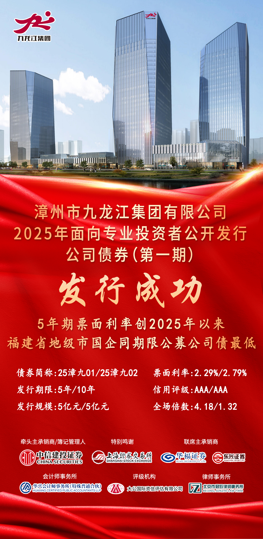 以上債券的成功發行,進一步優化了集團債務結構,降低融資成本,彰顯了集團在資本市場中的競爭力和影響力。下一步,九龍江集團將繼續堅守初心,勇擔使命,圍繞漳州市“9+5”產業發展,持續深耕主責主業,充分發揮國有資本投資公司的資源優勢,不斷優化資源配置,以集團高質量發展為引擎,助力漳州市經濟產業升級與產業融合發展。