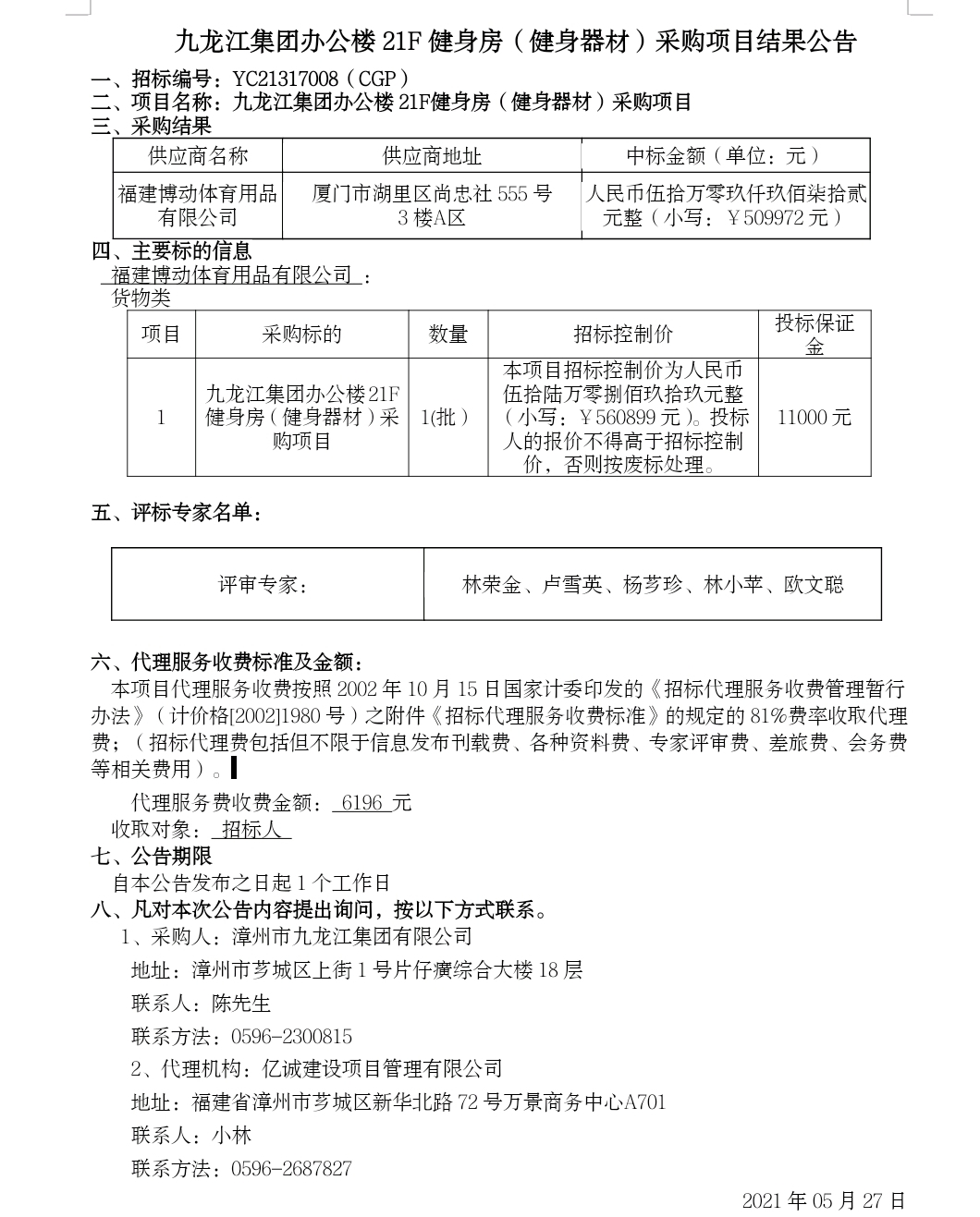 九龍江集團辦公樓21F健身房(健身器材)采購項目結果公告