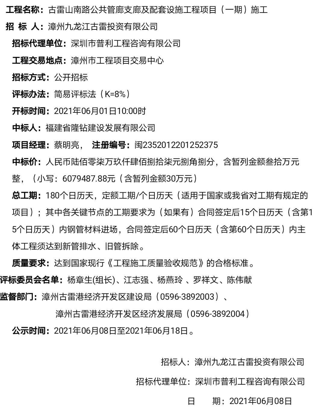 古雷山南路公共管廊支廊及配套設施工程項目(一期)施工中標結果公示